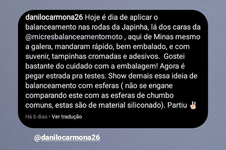 “Coloquei o produto na minha moto e logo testei indo viajar. Coloquei até 200 km e a estabilidade e segurança foi incrível. Recomendo o produto.”